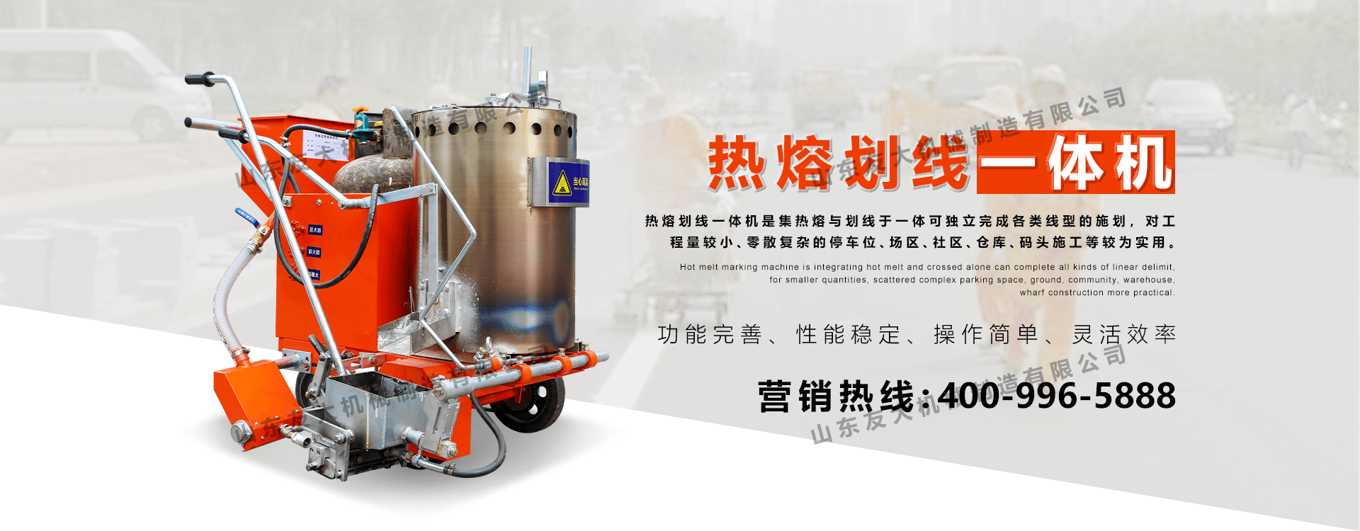 热熔划线一体机是集热熔与划线于一体可独互完成各类线型的施划,对工程量较小、零散复杂的停车位、场区、社区、仓库、码头施工等较为实用。