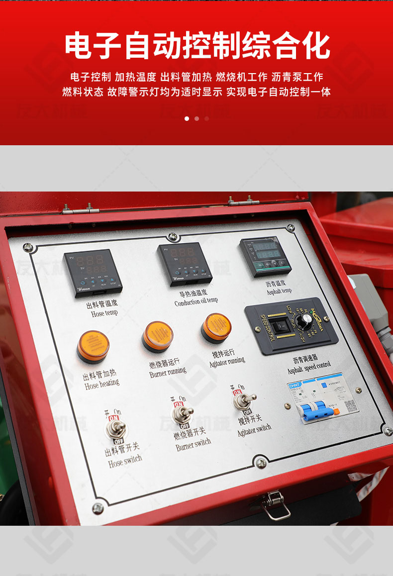 汽油灌缝机主要有手推式和自行式手持灌缝管操作,采用进口柴油燃烧器加热。在工作时首先在料箱内加入沥青或灌缝胶,启动发电机供电,依次间断打开导热油泵开关,燃烧器开关,出料管加热开关;调整自动温控系统与材料的温度相同,通过柴油燃烧器自动加热熔料箱内导热油开始升温(拖式为强制循环)使材料融化,温度是通过自控系统来控制。溶料时间大约30-40分钟左右。在材料融化、出料管温度达到后可以进行工作。手持灌缝管对正裂缝灌缝处理。沥青泵的出料流量可调。在工作过程中随时添加材料保证工作的连续性。注意:在灌缝前要对裂缝内的尘土进行清缝处理。
