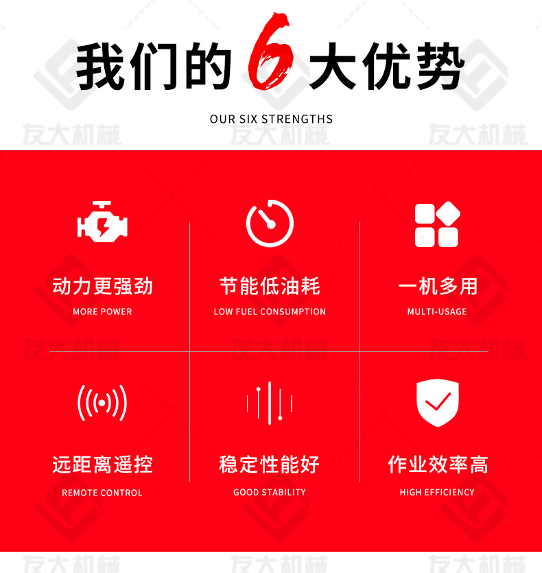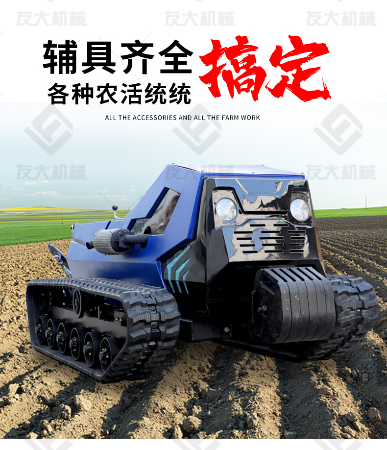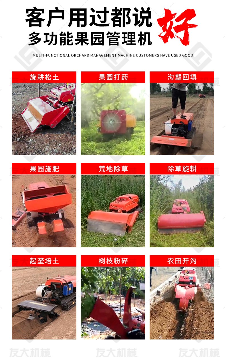 本产品采用履带式驱动设计,稳定性和爬坡能力较强,适应丘陵山地平原各种地形,机型小功率大,适应各种行距的果树,大棚,园林。产品动力强劲,结实耐用,性能优越,安全放心,远程操控,省心省力。
