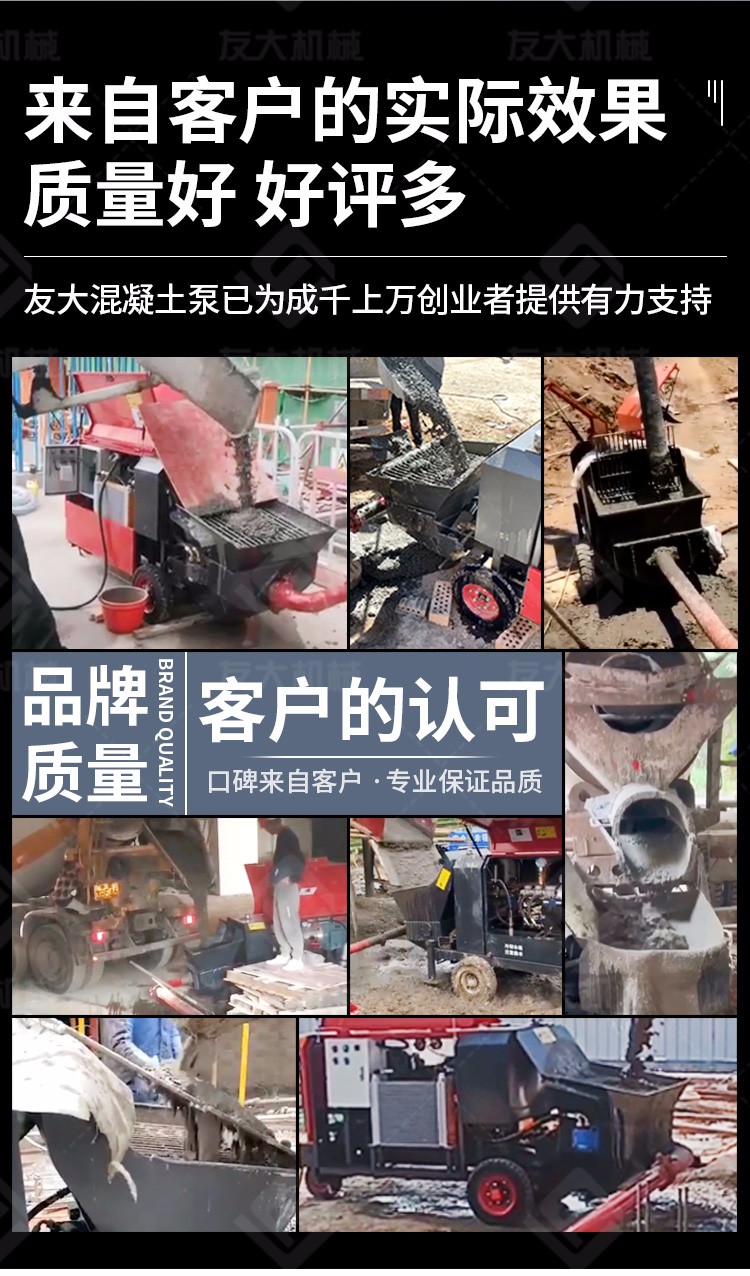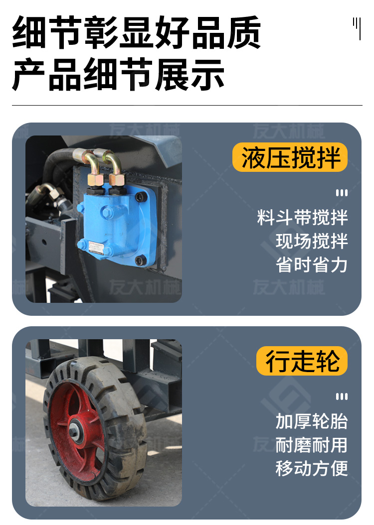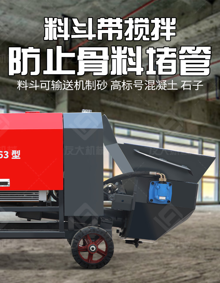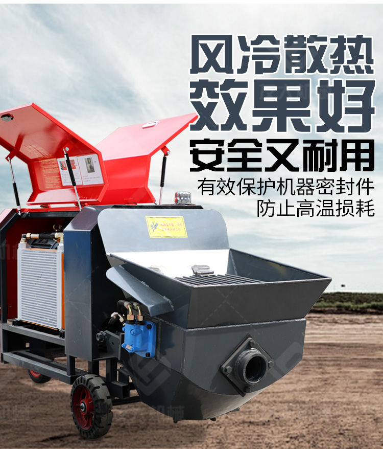 用独创的泵车尾轮驱动系统轻松解决移动时带来的各种困难;采用双排风冷散热系统散热效果更好,液压系统采用压力更高,性能更稳定的柱塞式自动变量主油泵,采用先进的三维立体压模一体式自动搅拌料斗可输送机制砂,高标号混凝土,有效缓解积料问题。