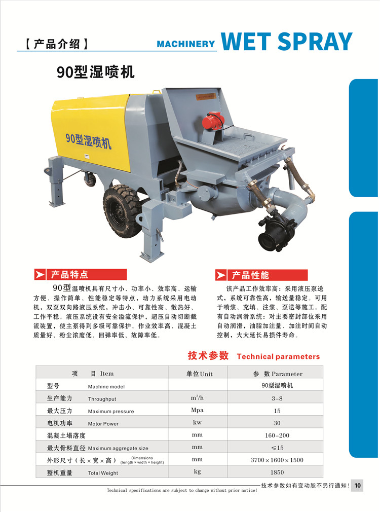 1.液压湿喷机(泵送式混凝土湿喷机)采用液压泵送式,系统稳定性高,输送量稳定。