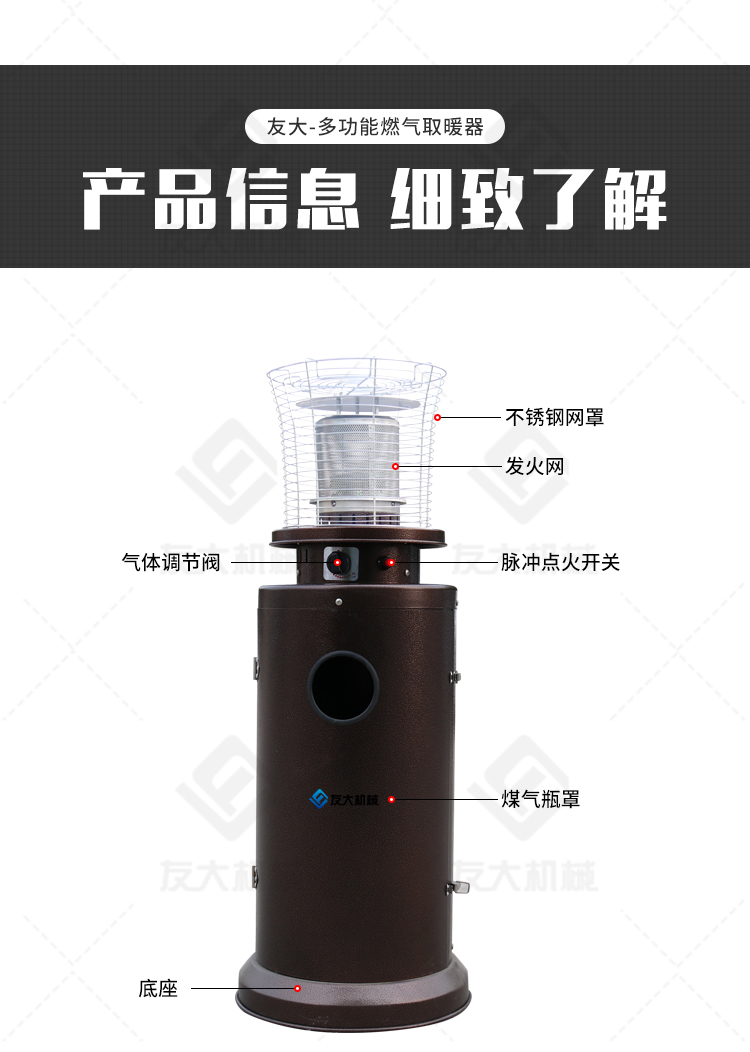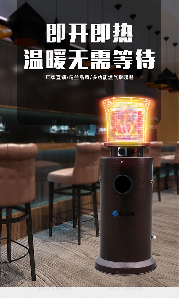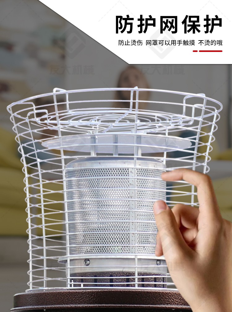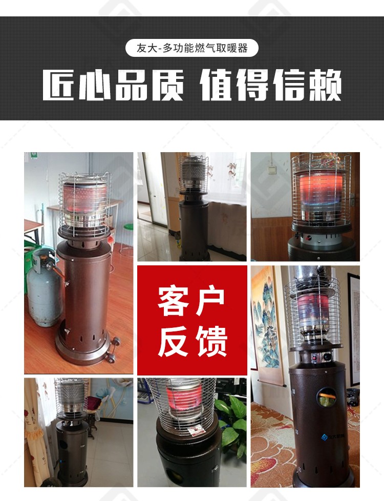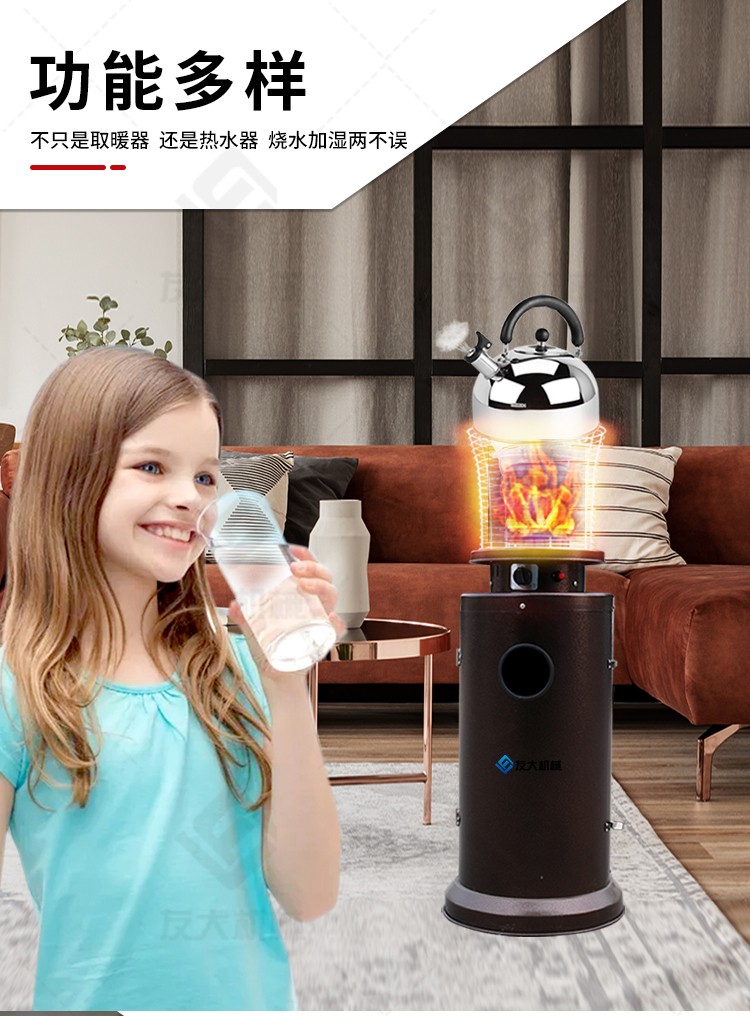 这是一款一机多用的燃气暖风机,可以取暖、烧水、烘干衣物,多功能,更经济。该机人性化设计,具有防烫设计,使用更安心。