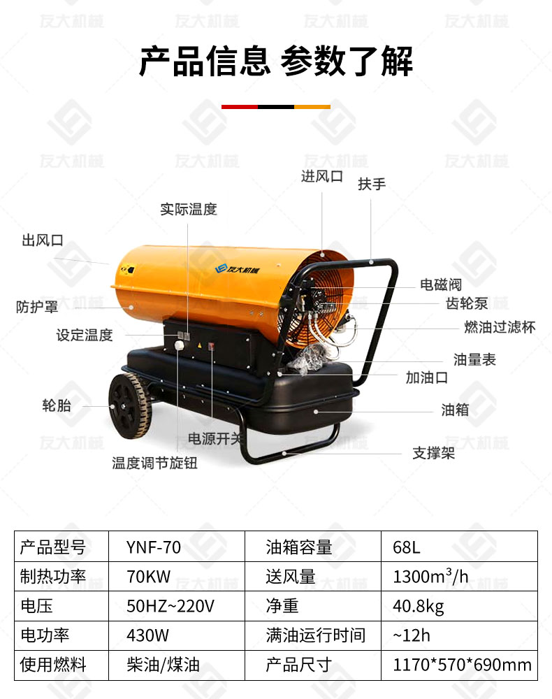 70kw燃油暖风机供热面积大,恒温控制,保证所需温度,是冬季取暖、烘干的好选择。友大机械生产有各种规格燃油暖风机,品质保证,售后无忧,欢迎来电咨询。