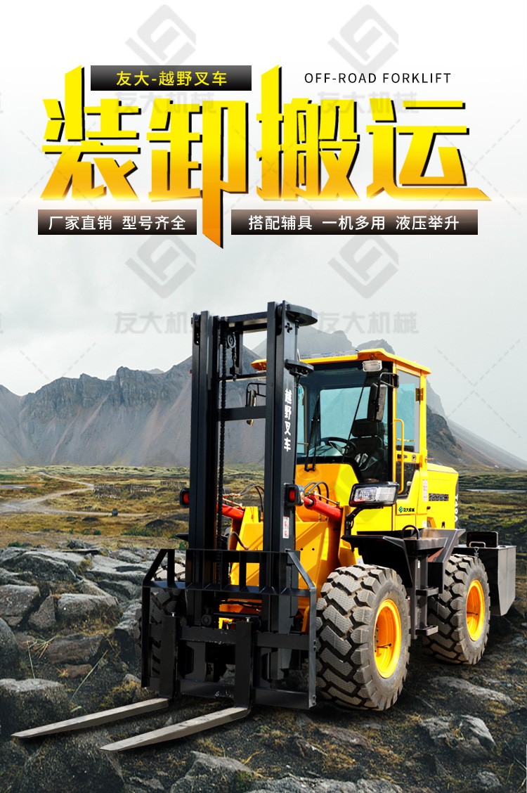 多功能四驱越野叉车可以在坡地和不平地面上进行货物装、卸、堆垛及搬运作业,具有良好的机动性、越野性可靠性。其功能多样,可搭配侧移器、调距叉、旋转器、软包夹、推出器、侧翻叉、侧翻斗、起重臂等工具完成不同的工作。