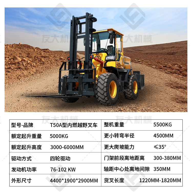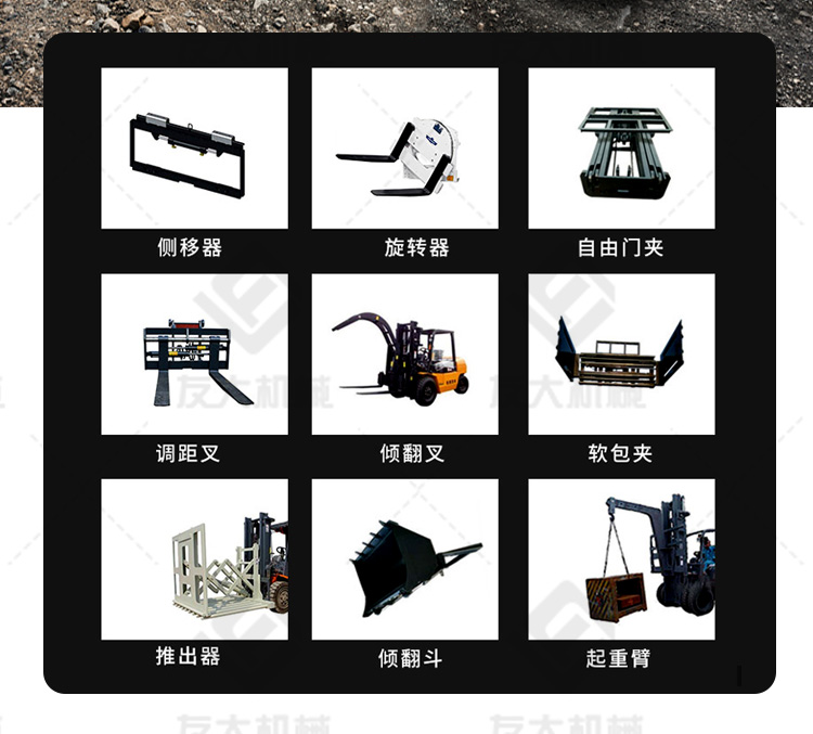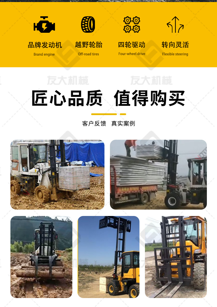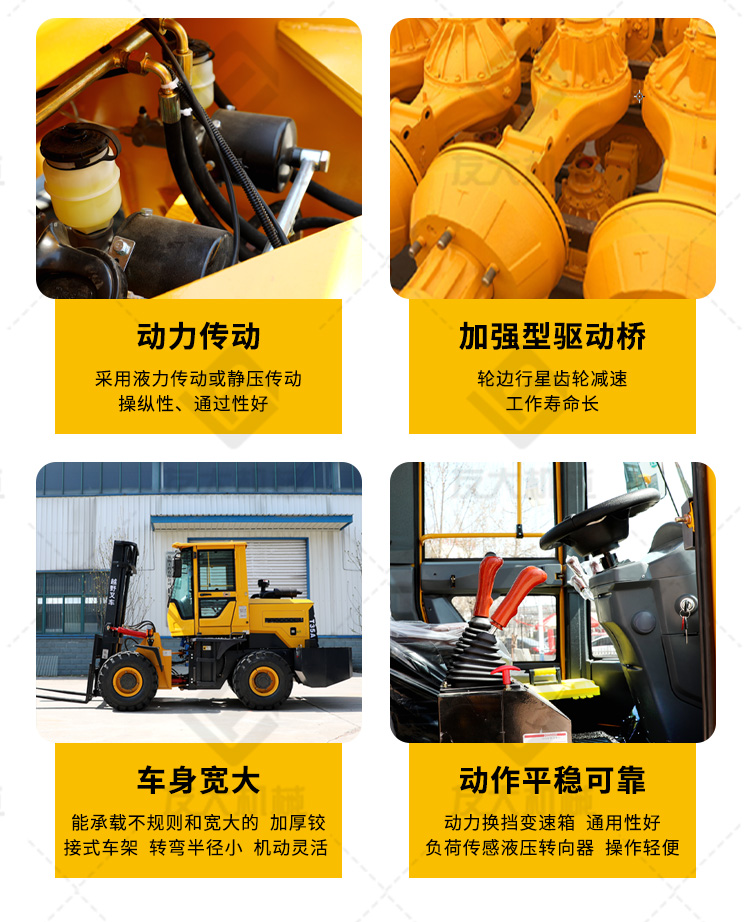 越野叉车可以在坡地和不平地面上进行货物装、卸、堆垛及搬运作业,具有良好的机动性、越野性可靠性。其功能多样,可搭配侧移器、调距叉、旋转器、软包夹、推出器、侧翻叉、侧翻斗、起重臂等工具完成不同的工作。