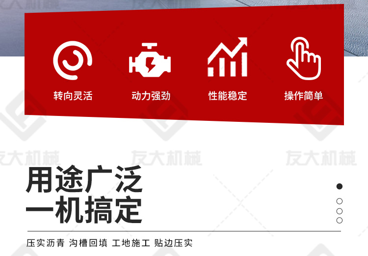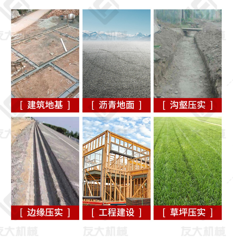 主要用于沟渠基础,道路,体育场地的压实整平,也可用于压实沥青表面的作业。