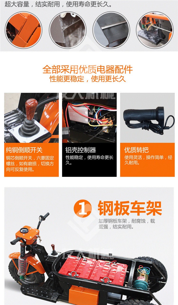 此款车适用于建筑工地、室内装修、养殖场、工厂等场所,运输沙子、水泥、土方、混凝土、建筑垃圾生活垃圾、养殖场动物粪便、饲料等,体积小操作简单灵活,可原地360度转圈,可进入楼层、楼道、电梯、吊篮等各种狭小空间作业,是您必不可少的装卸助手。
